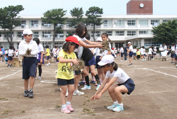 - 松崎小学校では、グラウンドの芝生化工事が行われています。今日は休み時間を利用して全校生徒がグラウンドに集まり、芝を蒔きました。