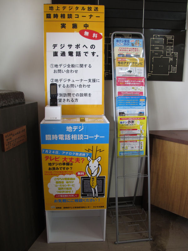 - 松崎町役場玄関ホールに、地デジ簡易相談コーナーを設置しました。 地デジに関するパンフレットや、電話による相談等で地デジに関するお悩みに対応していきます。