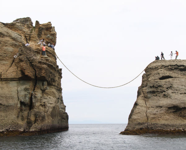 - 雲見観光協会では、2年前の台風で流されてしまった牛着岩の大牛岩と子牛岩を結ぶしめ縄を新しく作成し、張り替えました。
