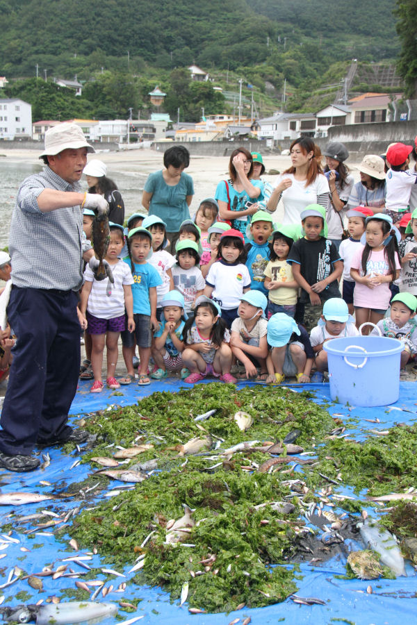 - 賀茂地区1市3町の保育園の4〜5歳児約200人が岩地海岸に集まり、交流しながら地引網を楽しみました。