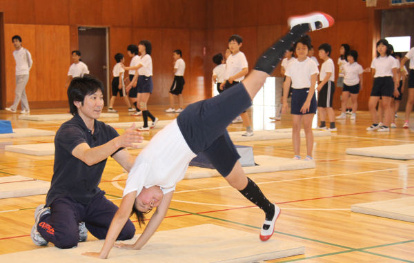 - 松崎小学校では、体操競技でアトランタオリンピックに出場した内山隆さんを講師にお招きし、5〜6年生へマット運動の実技講習が行われました。