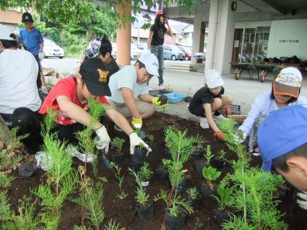 - 新世紀松崎三聖塾とみどりの少年団合同の花植えボランティア活動が行われました。 松崎十字の園の花壇が、多くの花で飾られました。