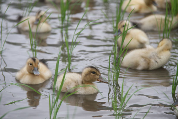 - 那賀地区の田んぼでは、カルガモ農法が行われています。柵で囲われた田んぼの中では、カルガモが元気に泳いでいます。