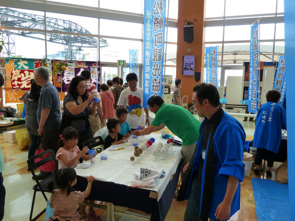 - 観光展では、パンフレットの配布を行うとともに、地場産品の試食や光る泥だんごやサザエキャンドルなどの制作体験が行われました。