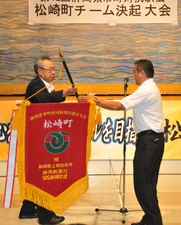 - 環境センター文化ホールでは、12月に静岡市で開催される市町対抗駅伝の決起大会が行われ、町長から監督へ団旗が委嘱されました。