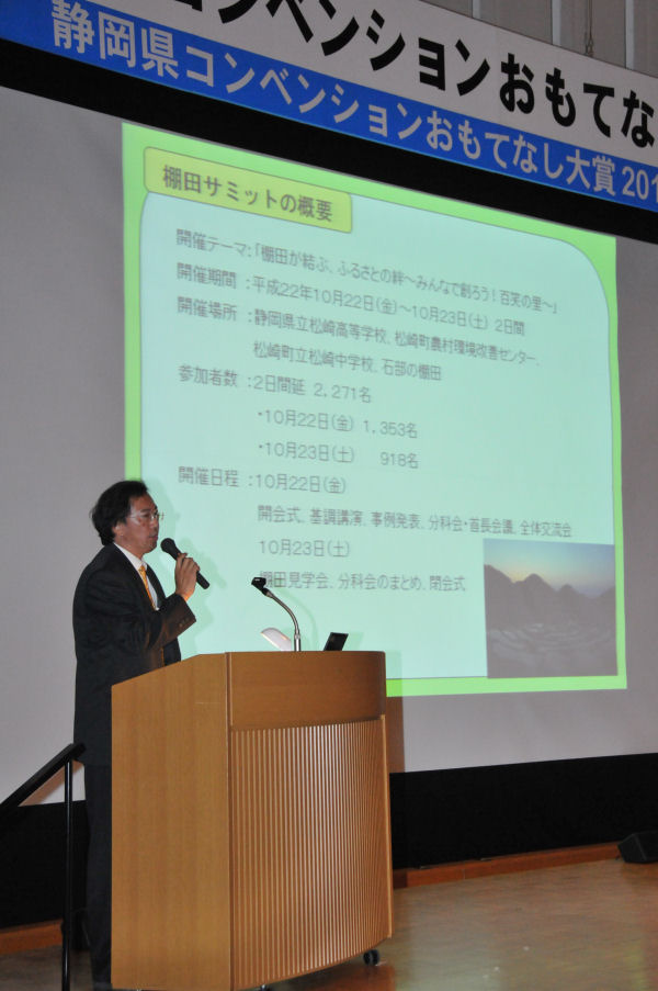 - 表彰式終了後に開催された静岡県コンベンションおもてなしセミナーでは、棚田サミットのイベント概要などを紹介を行いました。