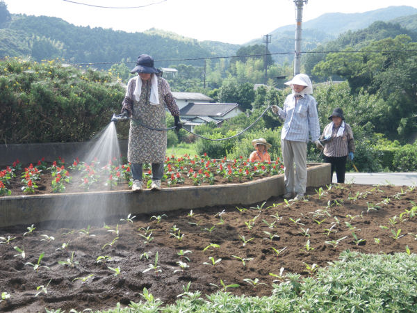- 松崎町花の会では、これからの夏を前に建久寺の県道沿いにある花壇の花植え作業を行いました。
