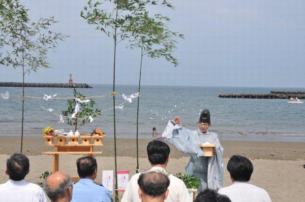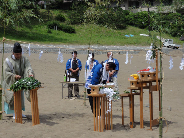 - 松崎海岸では、関係者が集まり、これからの夏の期間中の無事故を祈願する神事を行いました。