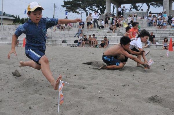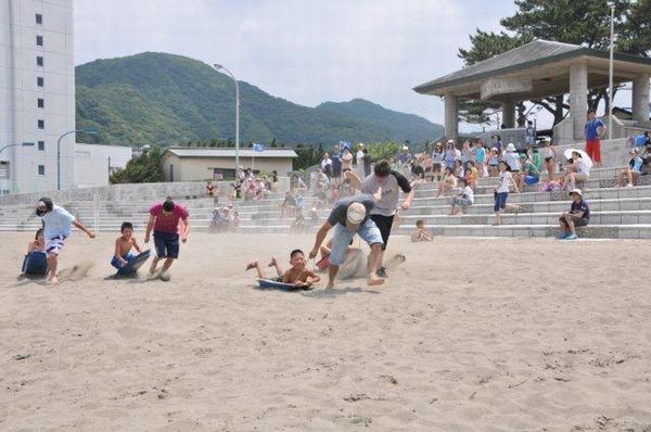 - イベントでは、子どもが乗ったソリを親が引っ張りタイムを競うソリレースやビーチフラッグが行われ、参加者たちは海辺で楽しい時間を過ごしました。