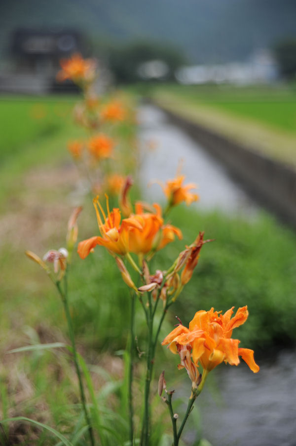 - 町内の土手や水路わきのあぜ道で、オレンジ色の花を八重に開いたヤブカンゾウが見られるようになりました。