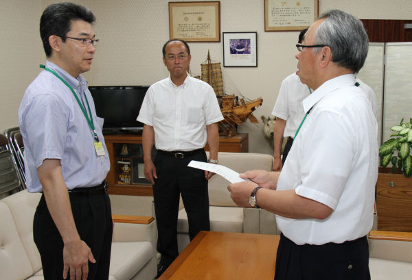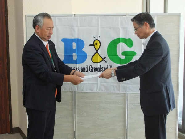 - 海洋センタープール改修工事に対する、助成決定通知書がB&G財団役員より齋藤町長へ授与されました。 工事は9月から始まる予定です。