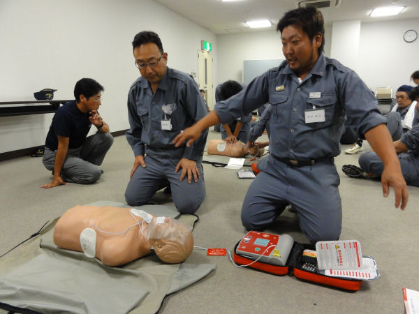 - 松崎町消防団による普通救命講習が行われました。AEDによる心肺蘇生法などを学び、海水浴シーズンに備えます。講習は明日も行われ、両日で60名の団員が修了証を取得します。