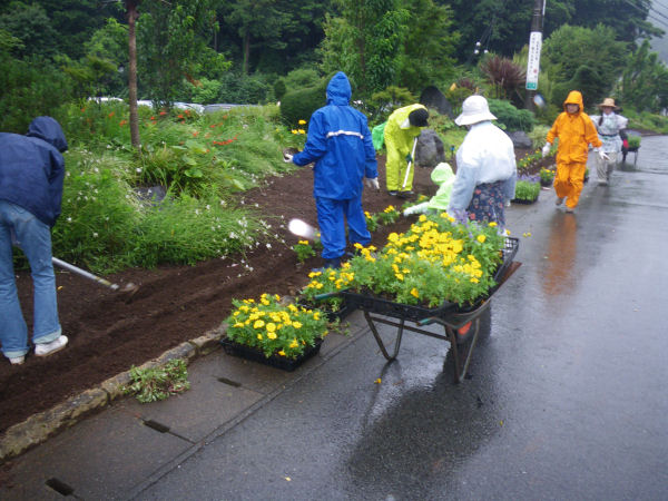 - 松崎町花の会では、雨の降る天気の中、道の駅花の三聖苑の花壇の植替え作業を行いました。
