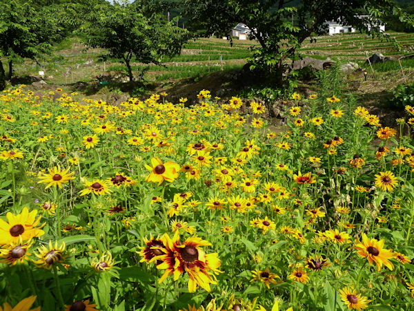 - 石部棚田にルドべギアの花が咲き、ミツバチや蝶、てんとう虫がたくさん集まっていました。