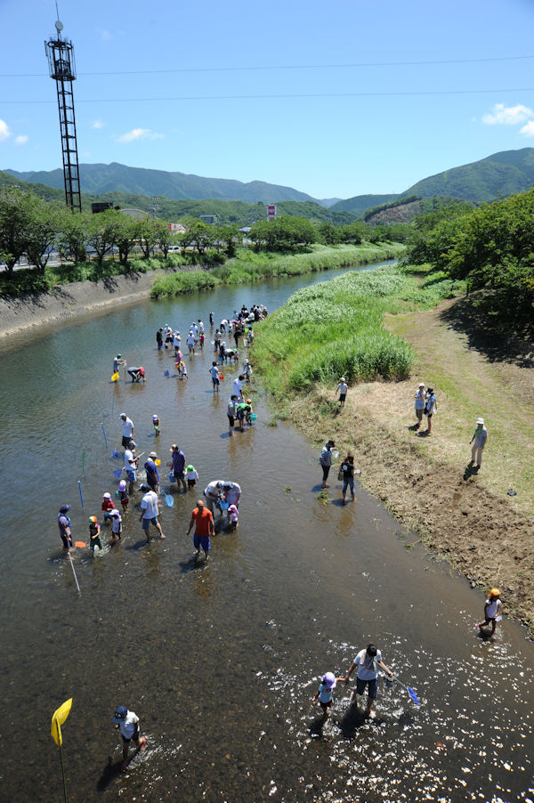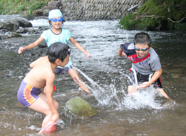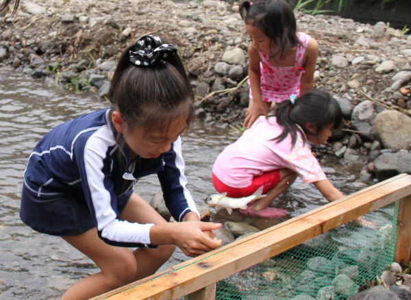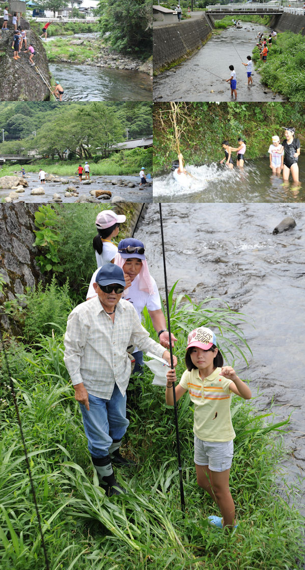 - 引き続き三聖塾午後の部では、大沢地区の河原で水遊びや川エビ獲り、川魚の釣り体験などが行われました。