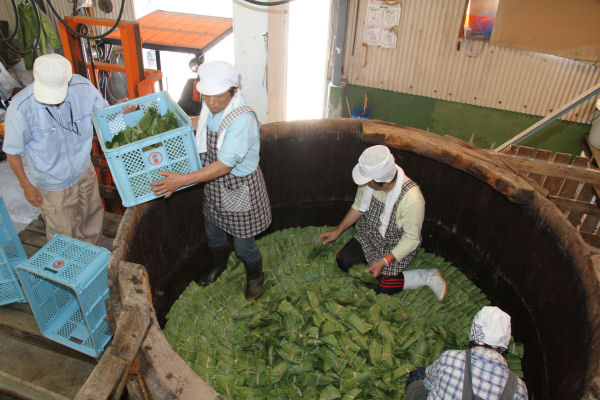 - 町内では、桜葉の収穫作業が最盛期を迎えています。町内の漬込み業者では、高さ2メートルほどの大樽への漬込みが行われています。
