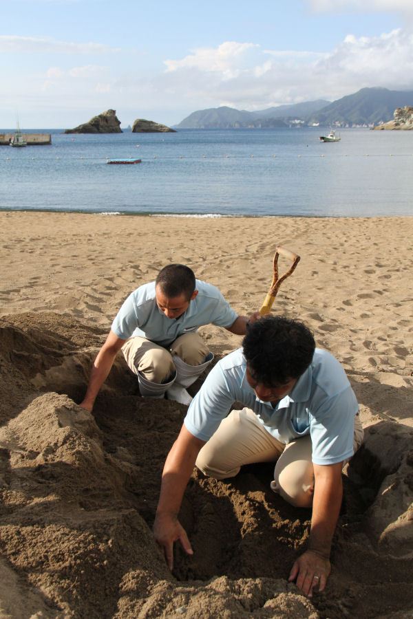 - 雲見海岸では、昨晩、アカウミガメが上陸した跡が発見されました。下田海中水族館の職員に調査を依頼した結果、上陸は確認されましたが、産卵はしていませんでした。今後、周辺の海岸に産卵に上陸する可能性が大変高いとのことでした。