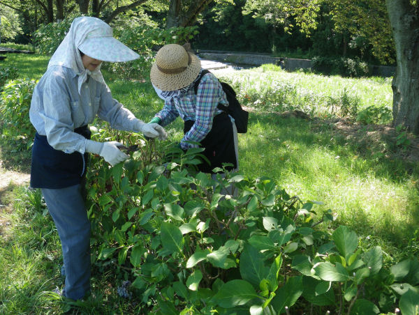 - 花の会の皆様により、那賀川沿いのアジサイの花切りが行われました。