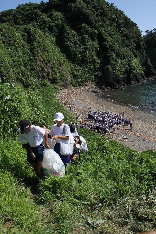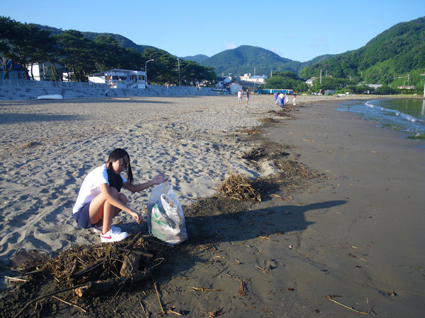 - 本日、早朝から中・高生のボランティア活動として、松崎海岸清掃活動が始まりました。 海水浴に訪れる方たちに、きれいな松崎の海を知ってもらおうと、先日の雨で打ち上げられたカヤなどを丁寧に集めました。