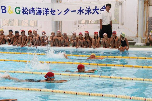 - 松崎海洋センターでは、第27回松崎海洋センター水泳大会が開催され、参加した小学生は日ごろの練習の成果を発揮した泳ぎを披露していました。
