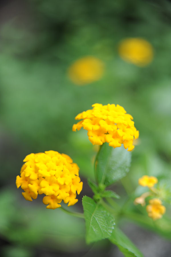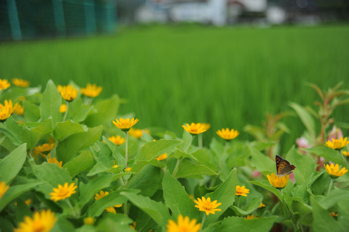 - 路地では、メランポジュームがきれいに黄色い花をつけています。 きれいに咲いた花には、ベニシジミが蜜を吸いに集まってきています。