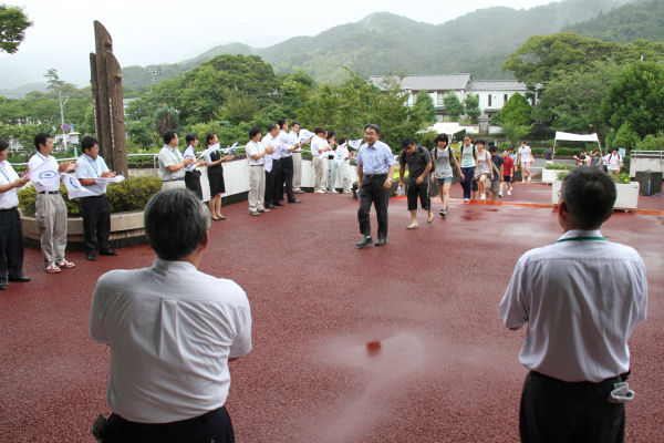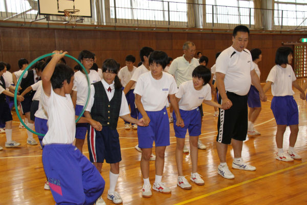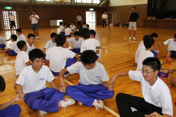 - 明日、松崎海岸で交流会を行う予定でしたが、台風の接近が心配されることから、予定を変更し、松崎中学校の体育館で交流会が行われました。