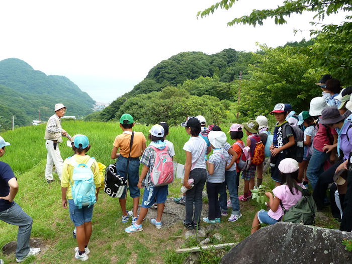- 今日は石部棚田を会場に、「棚田百笑くらぶ」7月の活動“棚田の秘密探検!”を行いました。 町内にお住まいの石田信稔さんを講師に迎え、水循環のしくみや棚田への水の引き込みなどを教えていただきました。