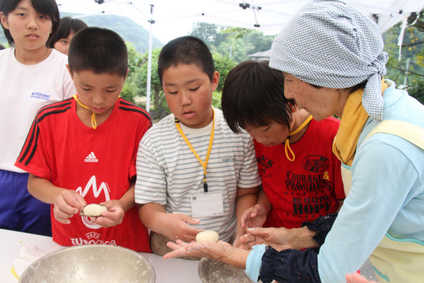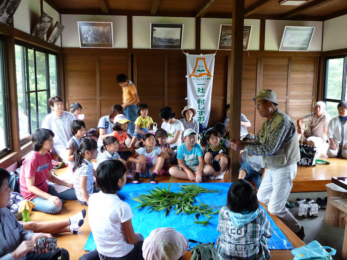 - 道の駅花の三聖苑では、松崎小学校5年生32人が参加して三聖塾が行われています。初日となる今日はひもの作りや竹皮まんじゅう作りなどを行いました。