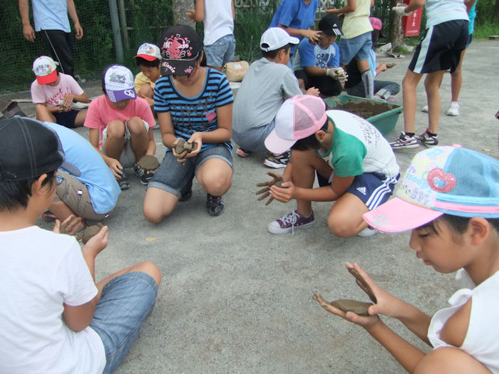 - 3日目となる三聖塾では、光る泥だんご作り体験が行われました。 通常の体験教室と異なり、今日は下地の砂漆喰を塗る工程から体験しました。