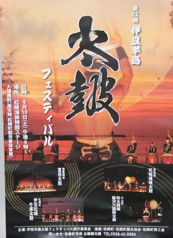 - 9月10日午後6時から松崎海岸特設ステージにて開催される第12回伊豆半島太鼓フェスティバルのポスターが完成しました。