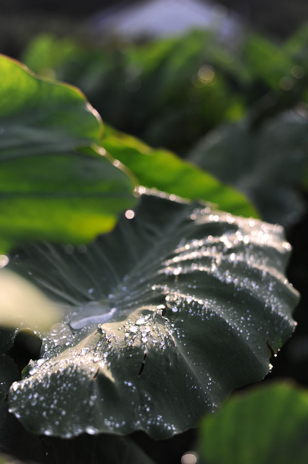 - 午後には黒い雲が急に広がり始め、短時間で強い雨が降りました。 畑の里いもの葉には、たくさん雨粒がつき夕陽に光っています。
