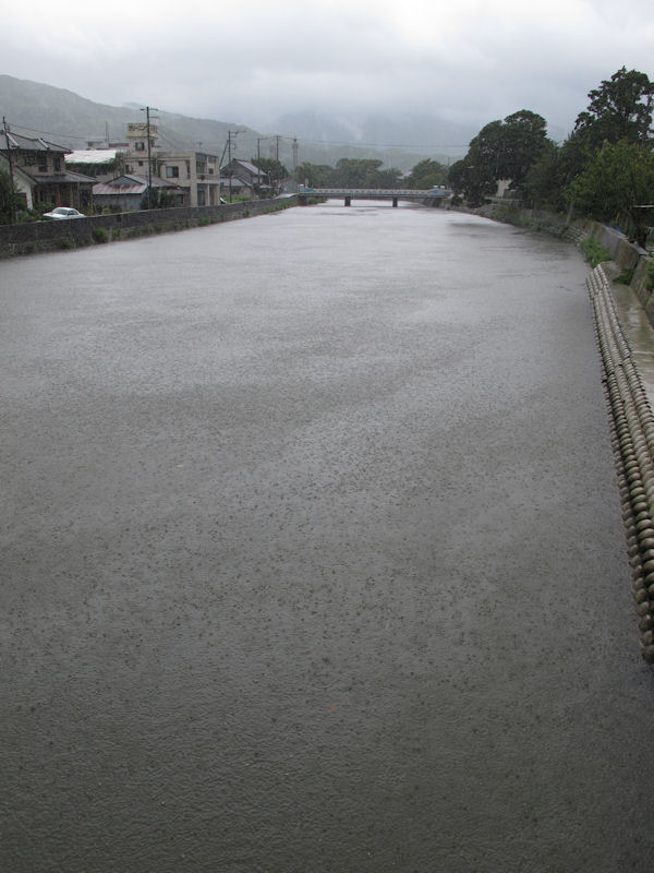 - 断続的な降雨なため、水量はあまり多くありませんが、濁りを帯びた水面に雨が強くたたきつけています。