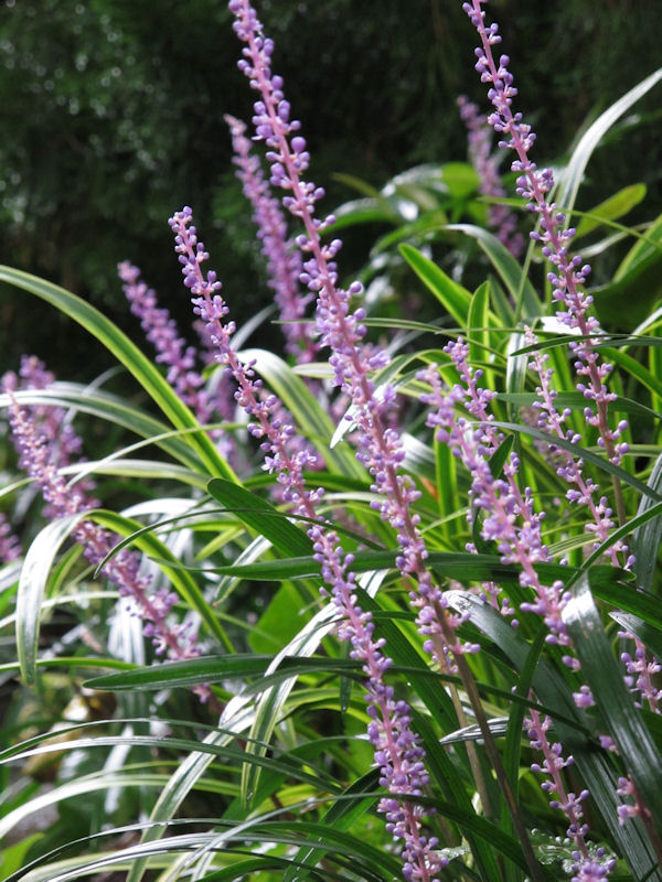 - 雨の合間、植え込みの根元にヤブランの紫色の花を見つけました。 いくつもの花を、天に向かって伸ばしています。