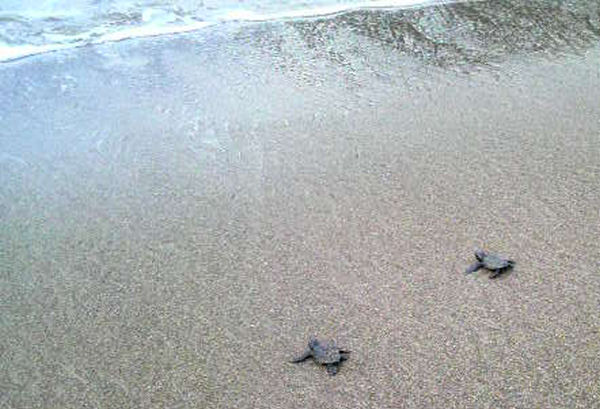 - 今朝、雲見海岸では、砂浜に産卵されていたウミガメの卵が孵り、小さなウミガメたちが一斉に海に帰っていきました。