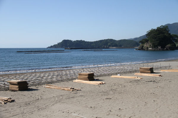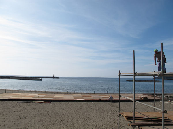 - 今週の土曜日に松崎海岸で開催される伊豆半島太鼓フェスティバルに向けて舞台の建設が行われています。