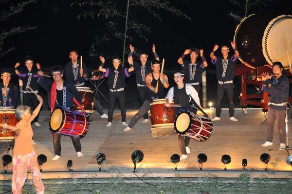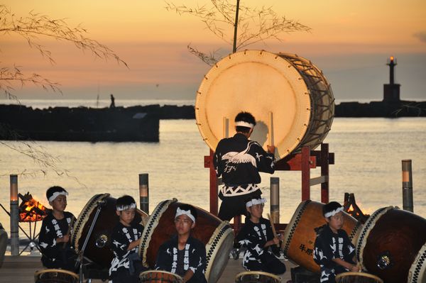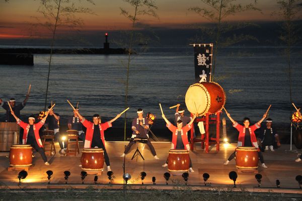 - 夕方から、松崎海岸にて、沈んでいく夕日をバックに第12回伊豆半島太鼓フェスティバルが開催されました。最初に演奏したのは、地元の太鼓団体である牛原太鼓でした。