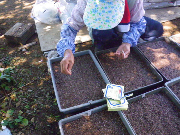 - 本日町内の育苗場では、松崎町シルバー人材センターの方々が、ビオラの種まきを行いました。 11月中旬には苗に育ち、町内の花壇に配布され、きれいな花を咲かせる予定です。