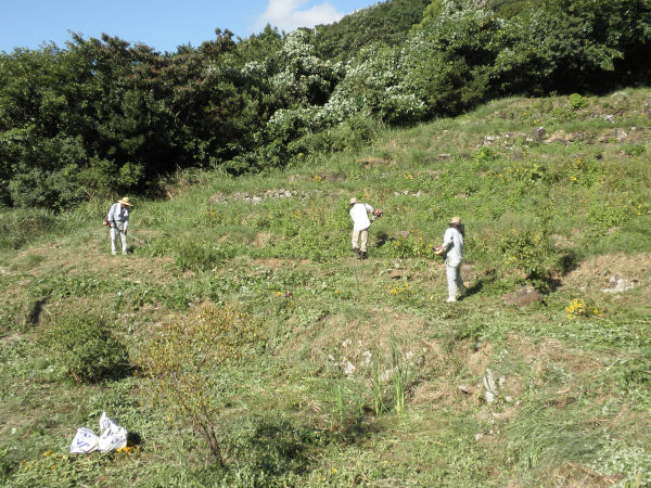 - うだるような暑さの中、石部の棚田の耕作放棄地では、棚田保全推進委員会の方々により草刈り作業が行われました。