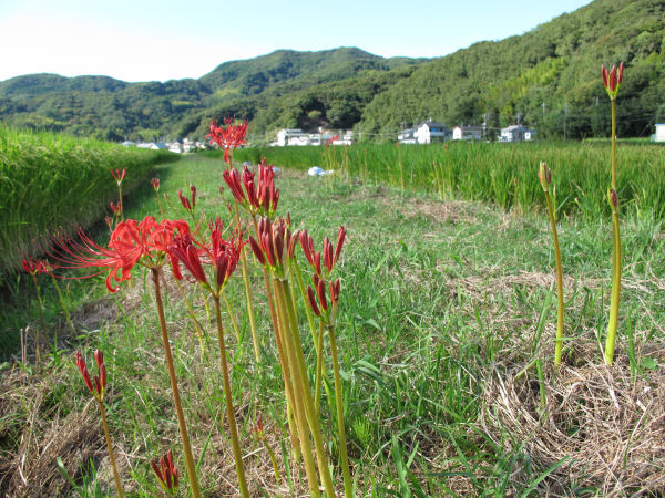 - 石部の棚田でも、彼岸花が咲きはじめました。つぼみもたくさんありますので、これからの見ごろを迎えるのが楽しみです。