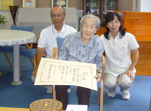 - 今年度100歳を迎えられた山本さんを賀茂健康福祉センター長が訪問し、静岡県知事から寿詞(賞状)と内閣総理大臣からの賞状と、銀杯を贈り、お祝いしました。