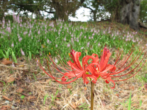 - 里山をじっくり探すと、彼岸花を見つけることができました。 地面から芽が顔を出している様子もいくつか見られ、お彼岸頃には真っ赤な花の群生が望めることでしょう。