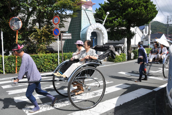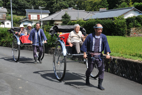 - 町内の各地区では、公民館などで敬老会が開催されました。人力車伊豆松崎組では、那賀地区の敬老会へ参加する方の中から希望者を自宅から敬老会会場まで人力車でお送りしました。