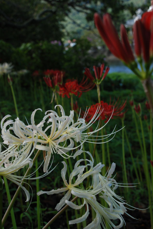 - 那賀川沿いの土手などでは、赤い彼岸花に混じり、白い彼岸花も開花し始めました。