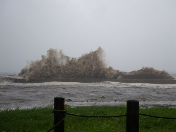 - 午後になると、茶色く濁った波が強く防波堤にぶつかり大きなしぶきをあげています。 写真は、松崎新港に打ち付ける波の様子です。