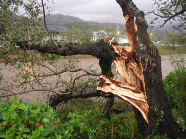 - 台風の強い風で、那賀川沿いの桜の大木が、縦に裂けてしまいました。