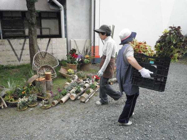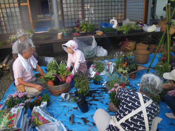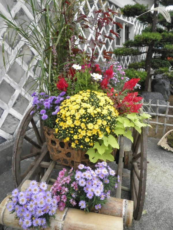 - 伊豆文邸周辺では、花の会の皆様が民具に寄せ植えした花を展示しています。