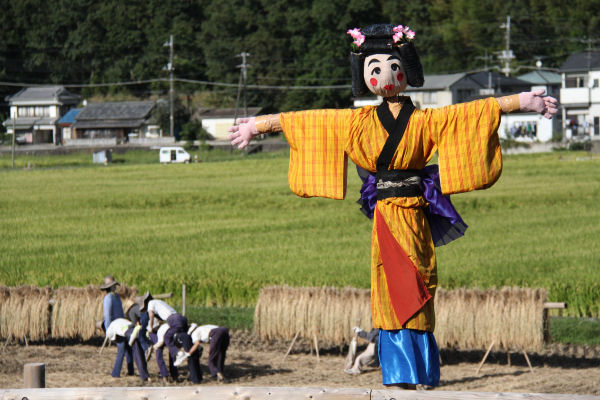 - 那賀耕地では、早稲の品種を栽培している田んぼで一足早く稲刈りが行われました。鳥などから稲を守るために設置されていた案山子たちも役目を終え、稲が刈り取られた田んぼで遊んでいました。