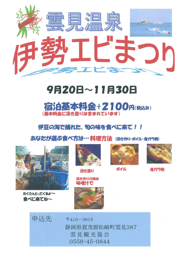 - 松崎町では、伊勢えび漁が解禁となりました。この伊勢えび漁の解禁に合わせ、町内の宿泊施設では、旬の味を楽しんでいただくため、伊勢えびまつりが行われています。