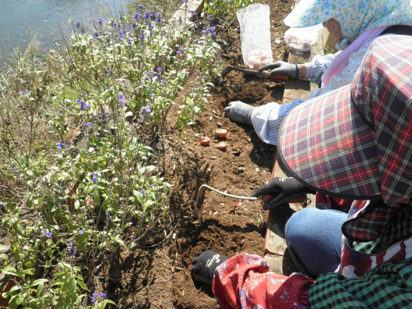 - 町内花壇では、花の植え替え作業を行いました。 写真は、チューリップの球根を植えている様子です。