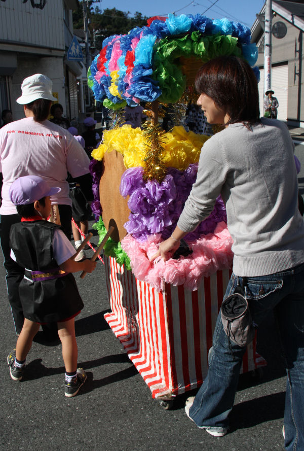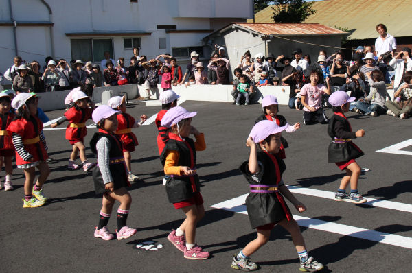 - 松崎幼稚園では、明日から町内各所で行われる秋まつりを前に、おまつりごっこが行われました。園児たちは、保護者の方や近くの住民の方たちに見守られながら、商店街を練り歩きました。
